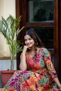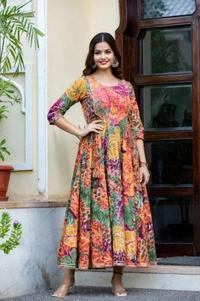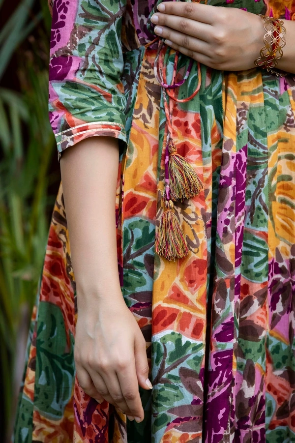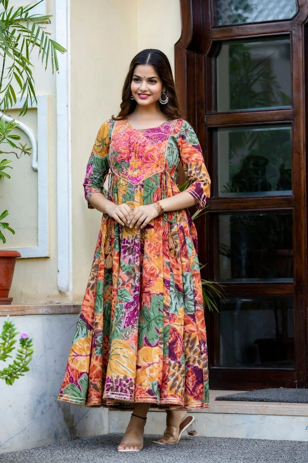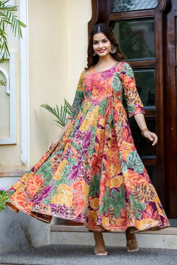 • multi colour printed, long gown in 28kali, embroidery worked on yoke with beautiful side tussels