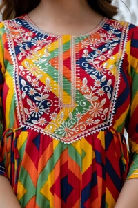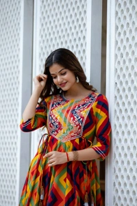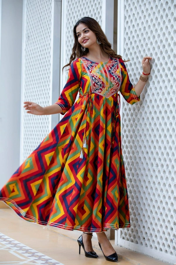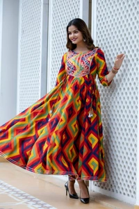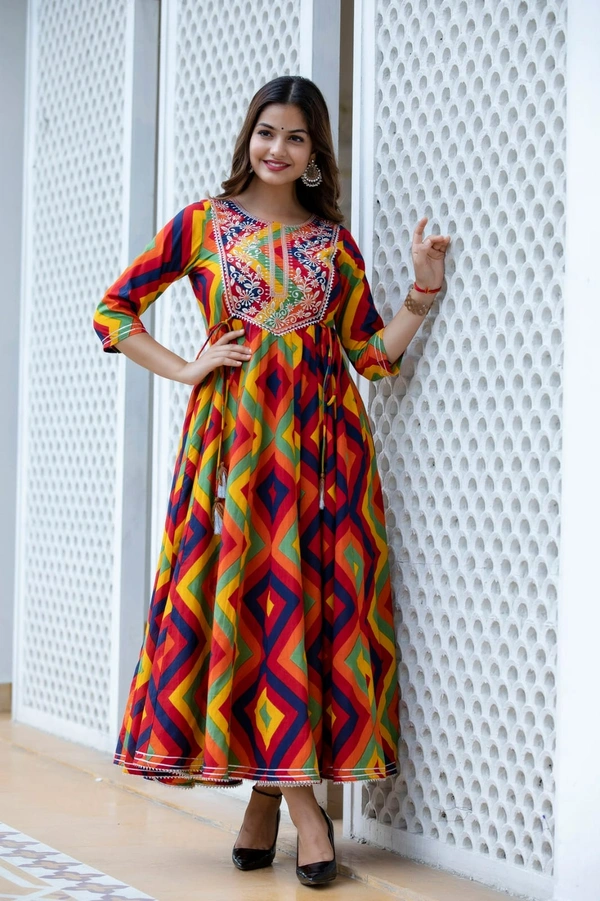 👗Multi colour printed, long gown in 28kali, heavy embroidery worked on yoke with beautiful side tussels