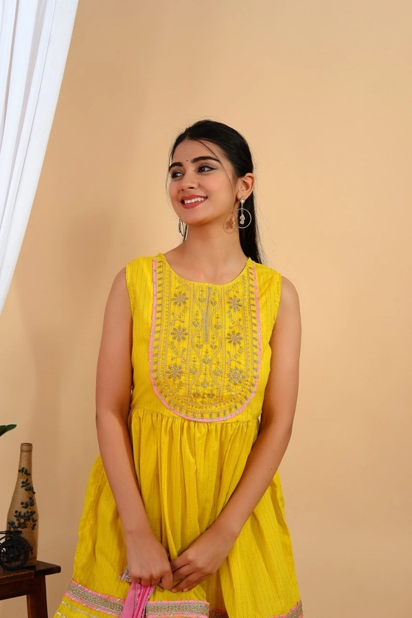 Premium heavy cotton lurex designer tire pattern gown with side slit detailed with heavy gota work all over.